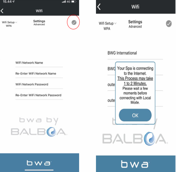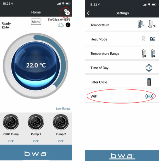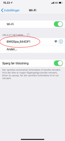 Du skal nå koble din mobilenhet til boblebadet. Første trinn går ut på at du skal gå inn på dine innstillinger på din mobil eller tablet og velge wifi. Under wifi skal du velge din wifi-modul som typisk heter «BWGSpa_xxxxx» (5 tall), eller lignende. Trykk på denne og koble til.
