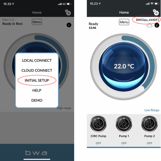 Når dette er gjort skal du gå inn på Balboa-appen og velge «Initial setup» i pop-up vinduet. Deretter skal du stenge appen helt og åpne den igjen. Du vil nå være i «direct mode». Du vil nå kunne se at navnet på din wifi-modul står skrevet oppe i høyre hjørne inne på Balboa-appen.
