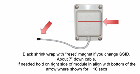 Bruk magneten som er montert på ledningen. Hold den på høyre side av modulen og trekk den sakte mot venstre. Fra- og tilkoble nå kontakten fra styringsboksen til din wifi-modul for å gjennomføre nullstillingen. Modulen nullstilles og wifi-adressen BWGSpa_ (fulgt av 5 tall) vil fremgå på den mobile enheten.